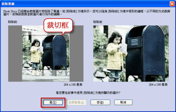 你可以一張一張裁切、調整。若照片太多,按全部皆是